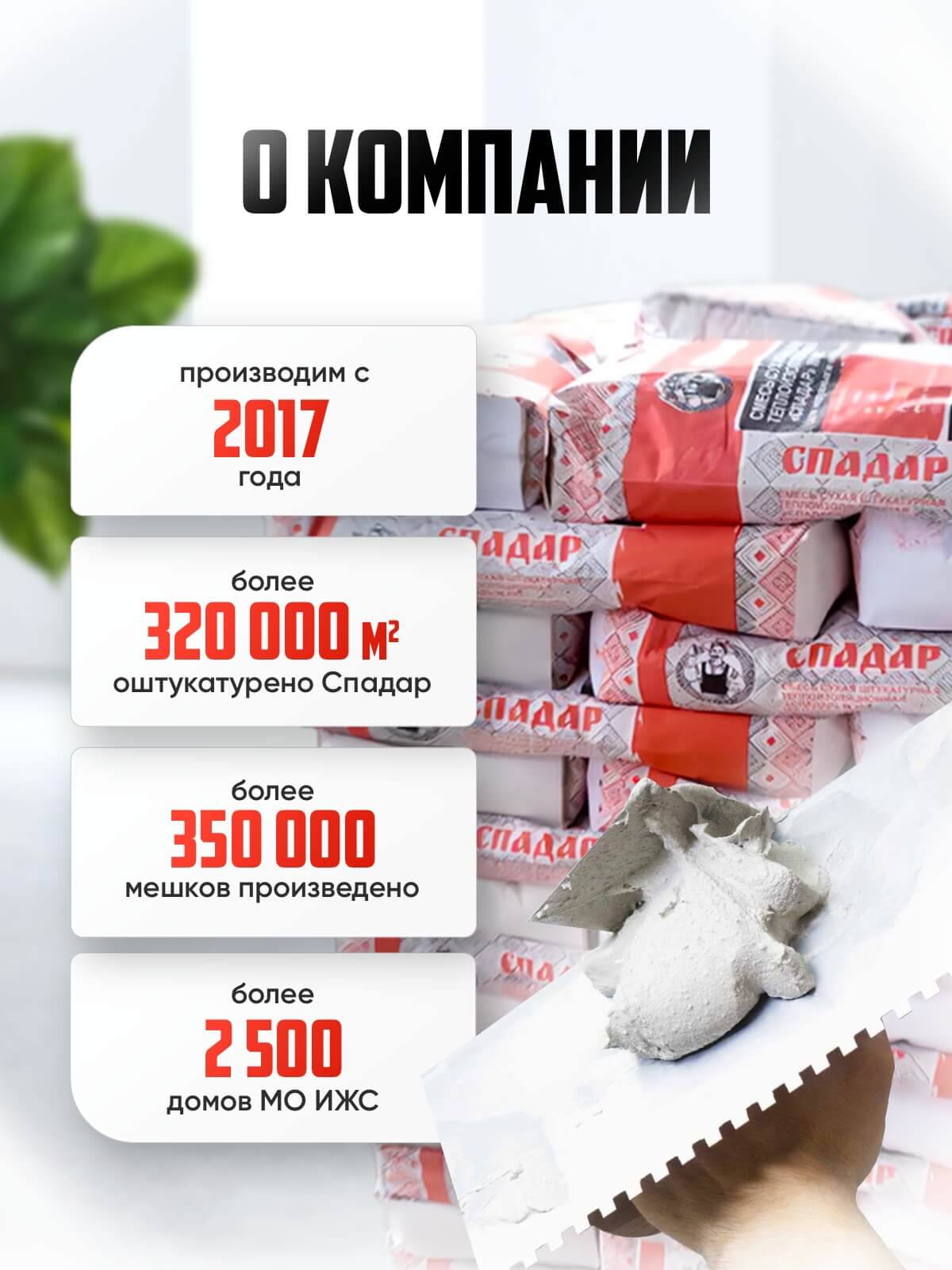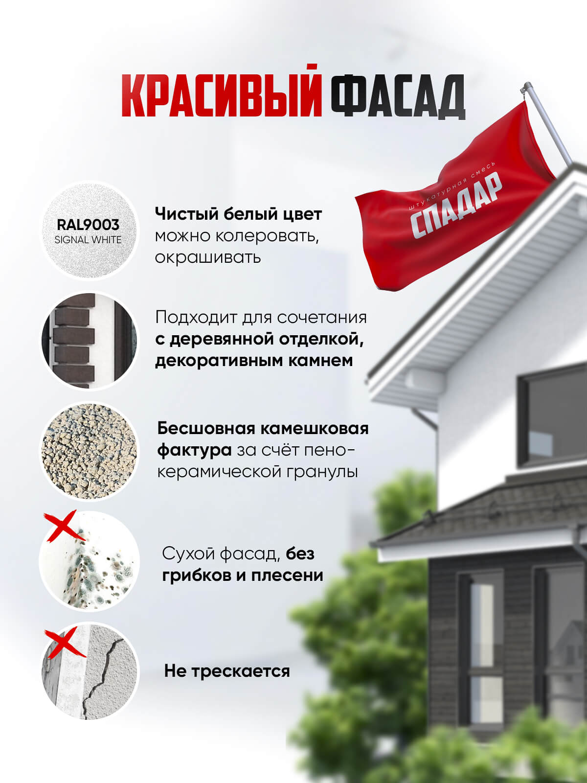 Белый цвет штукатурки за счет белого цемента в составе и камешковая фактура смеси за счет пенокерамической гранулы.